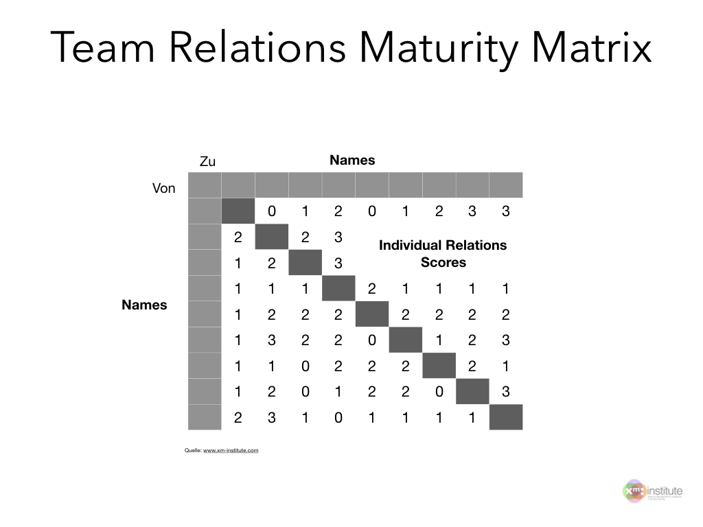 Jedes Teammitglied bewertet anhand von Reifegradstufen seine Beziehung zu allen anderen Mitgliedern im Team. Hieraus entsteht eine Reifegradmatrix.